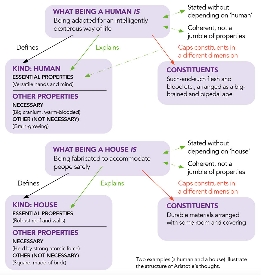 对于亚里士多德,应该燕尾的三个任务。If you can define what a chair is, you’ll also have explained why those bits of wood belong together, and why the chair is one thing, not a jumble of properties, and you’ll have implicitly placed it in conceptual structures we see in the world: for instance, a chair – a piece of domestic furniture – an artefact – a physical object.