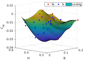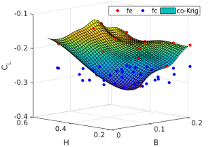 研究团队建造了几个甲板形状的空气动力系数的4D共同克里格替代表面,使用高和低保真计算流体动力学模型。Kriging基本上通过计算点在附近的附近的加权平均值来预测特定点的函数的值,类似于回归分析。Co-Kriging利用协方差率延伸了Kriging方法,并且可以基于少数昂贵且许多廉价,容易获得的数据构造昂贵的功能。