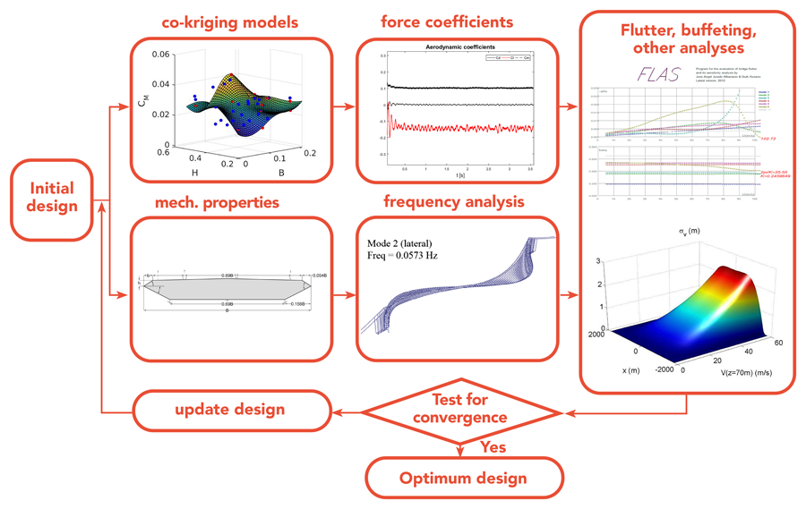 Kusano博士解释了低保力模型用于预测空气动力系数相对于缺乏适当的高保真数据的形状设计变量的趋势。这使得能够计算特定甲板(表面)形状的空气动力学系数的精确估计,便于对颤动和抖动现象的桥接性能的分析。一旦研究团队确定了对每个单独的甲板形状的风负荷下桥梁的性能,它们就会执行桥式甲板的设计优化。