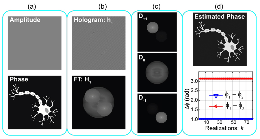 通过相移DHM (PS-DHM)技术,可以在主图像旁边创建不同相移的图像。从这些“相位图”中,重建算法可以更好地计算从摄像机到目标物体不同部分的距离,从而获得更精确的3D图像。在某种程度上,PS-DHM允许研究人员减轻重叠衍射级的影响,但这种方法有其自身的局限性。Doblas博士描述道:“需要移相技术来恢复复杂的物体信息,因此需要多次全息记录。”“传统的PS-DHM方法需要准确了解记录的全息图之间的相移。然而,在实验中,这样的精度往往是困难的,导致使用不精确的相移值,产生扭曲和不可靠的相图。”