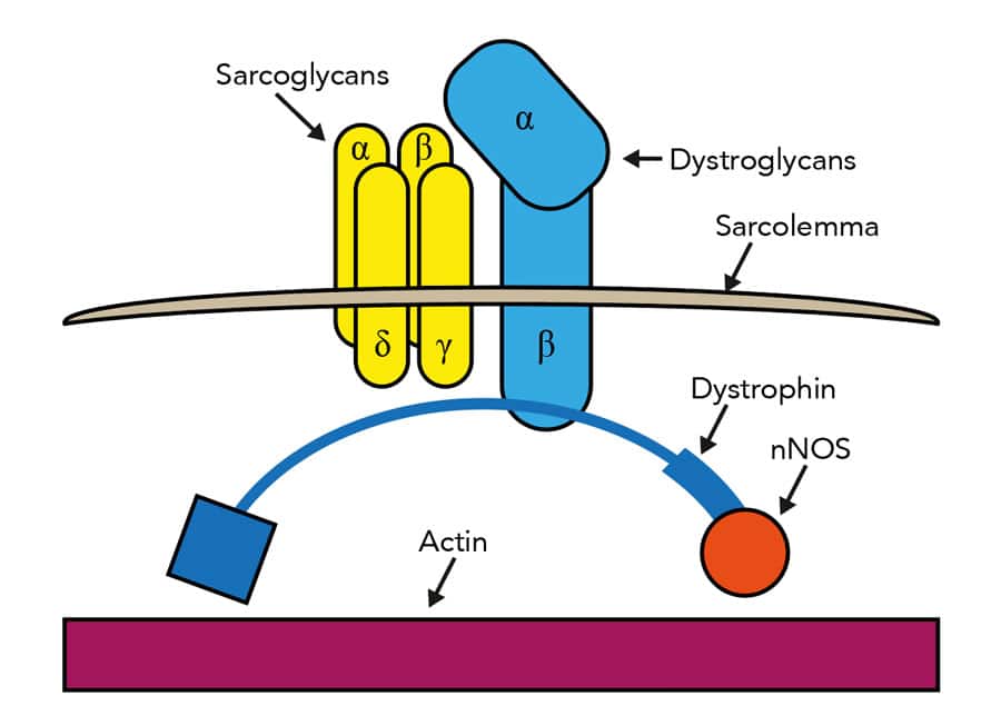 营养蛋白实际上是位于包围肌细胞的膜中的分子复合物的一部分。复合物的其他成员包括称为Sarcoglycans的蛋白质,并且Sarcoglycan基因的突变导致另一种类型的MD,肢体腰带MD,其始于肩部和骨盆的肌肉。