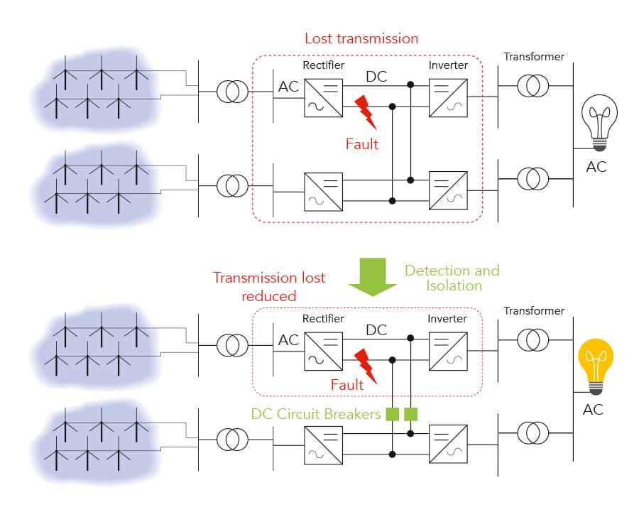 如果在直流电源网络内发生故障,则必须尽快限制电流流动,以防止网络的其他部分运行超出其设计参数。目前可以使用AC断路器实现,这可以隔离整个直流系统导致电源损耗。这将意味着如果未来的风装置,包括五个风电场的网络运行并且与一个农场的连接发生了故障,则所有五个都必须隔离,没有电力将从四个工作系统流出。英国电网运营到某些供应质量标准,即排出网络可以承受的最大功率损耗为1800MW。目前,现有海上风电场的任何此类损失都在网络运行限制范围内,但最多可从未来从海上风中采购的高达30,000MW电力,隔离更大的容量可能超过这一最大值。这将导致严重的影响,没有减缓技术,可能导致在英国电力网络的部分内停电。DC断路器是商业上可用的,可用于管理DC网络中开发的故障。然而,为了保持功率流动,这些需要将患处分离在两到五毫秒内。目前可用的技术无法达到这些限制的最快,因此需要新的开发。