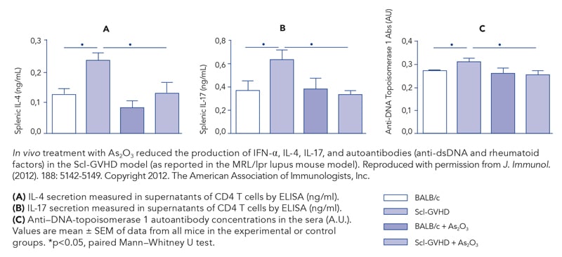 三氧化砷处理自动机疾病的潜力首次发现于2000年代头十年,当时CNRS团队在动物模型lups(自动机疾病引起人体大范围炎症和系统机故障)中建立治疗效果成功证明砷三氧化物可预期为某些自动机疾病特殊治疗剂鼠标使用自模拟淋巴综合症(ALPS),该综合症与人小儿lupus相似,证明三氧化砷能纠正免疫系统异常功能砷大幅提高ALPS鼠生存率显示它保护年轻动物避免开发综合症,而在老年受创小鼠中,砷三氧化物使该疾病几乎完全消失