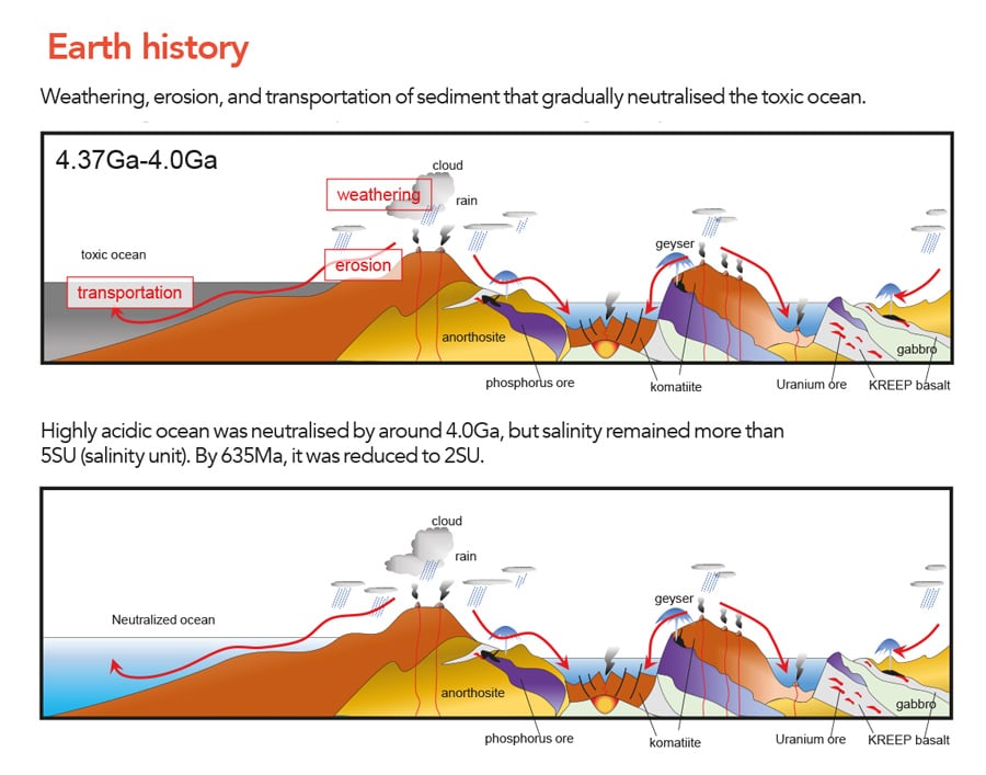 - 最后,多样化的环境是生命诞生的必要条件。pH值、盐度和温度的变化将有助于驱动不同类型的反应,导致更复杂和不同的有机分子。不同的环境会通过板块构造在地球大陆上发生,但在海洋中却没有。