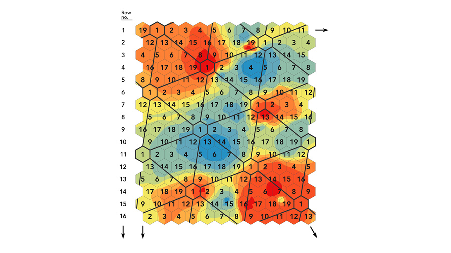 蜂窝选择设计通过在整个土地上形成移动的、完整的重复和三角形网格,克服了土壤特征的空间变化的影响(图1和2)。土壤异质性包括多种因素,如植物养分有效性、土壤结构和pH值,保持水分的能力,更重要的是,保持土壤中致病或有益微生物的存在。该设计能够对土壤和环境异质性的全谱进行有效取样,确保所有植物和亲本株系都能在可育和不太可育的地方的可比生长条件下进行分配。图1所示的三角形网格说明了线路编号的植物是如何生长的。1在不同土壤条件和空间变异中有效分配。