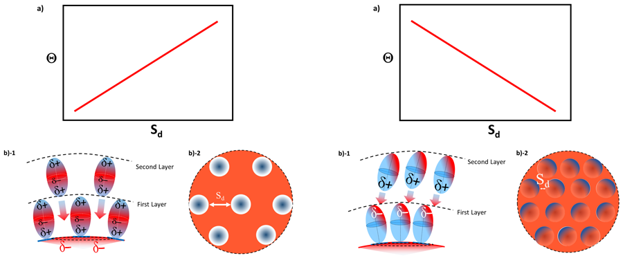 该团队继续揭示每种肽类型的更多化学信息,通过找到一个关于相邻肽之间的距离(Sd)与肽对金纳米颗粒的“覆盖率”(Θ)的一般规则。在α β1-40或α-syn包被的纳米粒子,随着第一层相邻肽层之间距离的增加,强烈邀请第二层肽层的形成,从而实现更致密的堆积。据推测,这些肽的顶部和底部有一个轻微的正电荷或“尖刺”,而在它们的中部有一个轻微的负电荷。这些部分电荷是肽中特定氨基酸序列的结果。