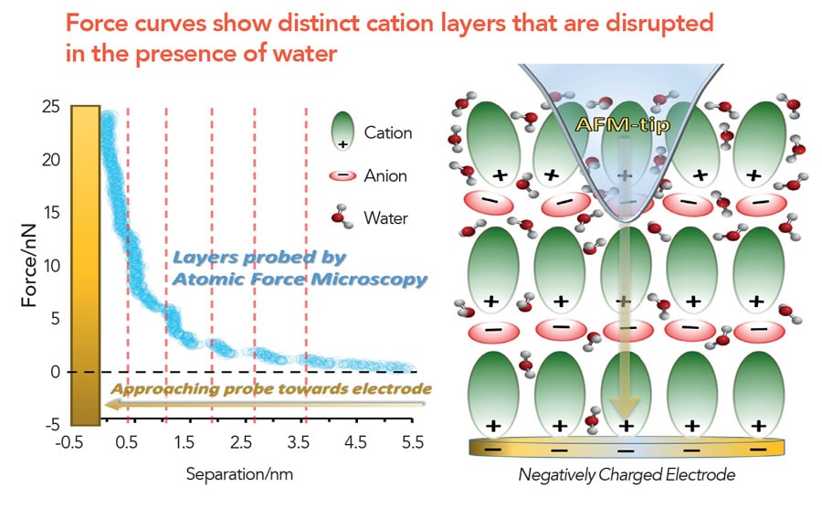 这些阳离子层对Silvester博士的研究具有重要意义。由于RTILS如此多样化,她的团队指出,它们形成的层的性质可以通过仔细选择要使用的盐来精细调整。“虽然在没有水的情况下有明确的结构,但在水的情况下会破坏。小,亲水阳离子不能阻挡水到达电极表面,但较大的疏水阳离子可以有效地屏蔽电极。“这表明,为了保持稳定的电流作为湿度变化,具有更多疏水性阳离子的RTILS是最佳选择。