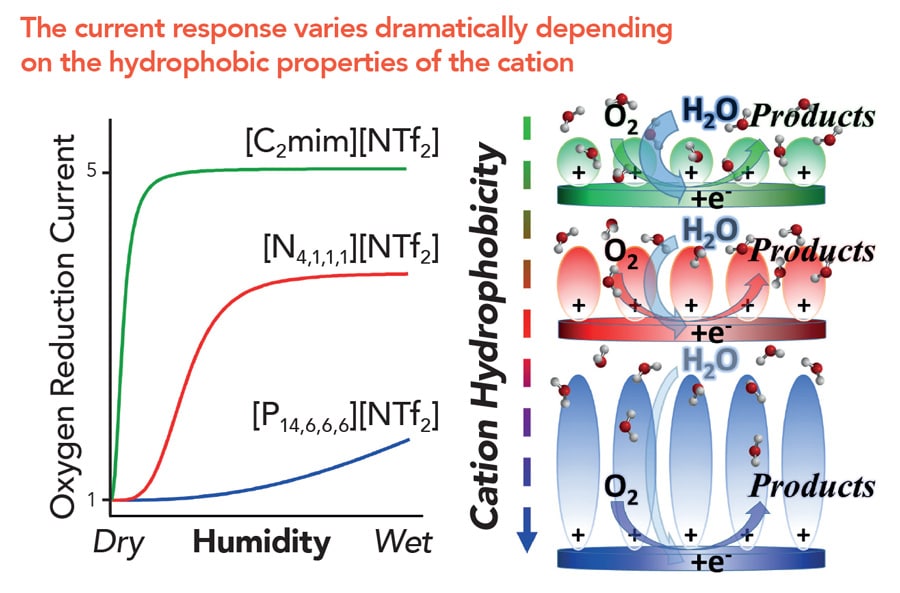 “阴离子在高湿度水平下对电流响应的影响最大,这与体积水溶性一致,”Silvester博士描述道。“然而,湿度较低时的电流主要是由阳离子决定的。”研究小组认为,由于阳离子在电极上聚集成一层正电荷,以平衡表面的负电荷,所以阳离子反应出现了这些差异。取决于阳离子的结构,它们要么形成非常致密的疏水层,很好地排斥水,要么形成密度较低的层,含有更多的亲水阳离子,不太擅长排斥水。