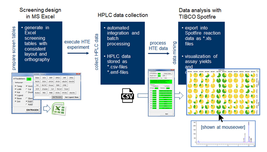 Santagostino博士及其同事还开发内部方便用户数据分析工作流程可视基本脚本用于自动提取HPLC色谱输出值数据(高性液相色谱技术用于分离识别混合成分)。允许通过tibcoPortfire软件可视化数据挖掘和派图图形显示批量段表示关键响应组件的实验丰度(例如,如果分解反应产生其他物质,除期望产品外,总输出面积将低于100%)。方法验证四大交叉反应 文献前报告, 在每个案例确认报告条件在所有实例中,通过使用报告文献条件中未使用之池分解法确定条件改善