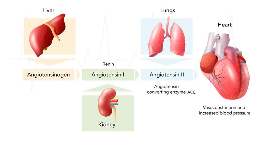 RAS激素系统对调节血压至关重要,控制心血管和肾脏系统中的稳态。肾脏检测到低血压,引发肾素释放到血液中。该酶切割血浆蛋白血管紧张素以形成血管紧张素I.另一种酶,ACE(血管紧张素转换酶)将血管紧张素I(Ang I)转化为血管紧张素2(Ang II),这是一种生物活性八肽。Ang II从肾上腺诱导激素醛固酮的释放,导致血管收缩(血管缩小),并增加血压与最佳水平。