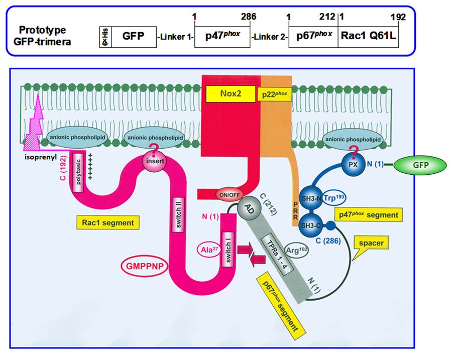 这项研究允许教授选择和他的同事详细了解NADPH氧化酶的结构和功能。作为下一步,研究人员决定通过粘附在酶的不同组分中粘合在一起的部件来产生嵌合分子(嵌合体)。事实上,该团队创造了他们所谓的“修剪”,这意味着由三个部分组成的嵌合体,每种部分由酶的不同细胞溶质组分取出6..修剪的每个部分被选择包含一个或多个“有源站点”,其在用作三方组的构建块中的组件中存在。