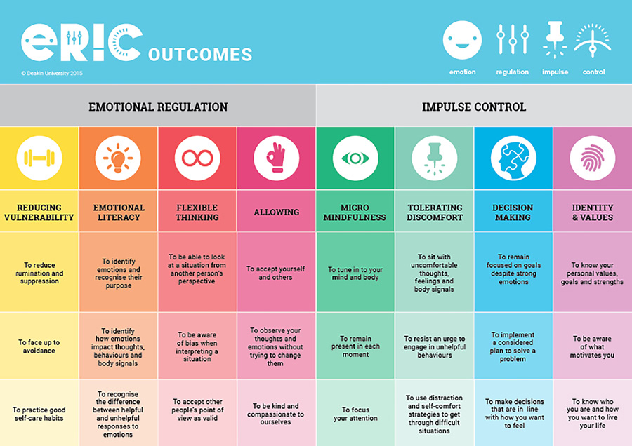 ERIC整合并利用现有情感调控理论在情感调控和脉冲控制八个领域实现每一个领域都产生代表健康发展的结果这些领域的技巧和过程均以模块化格式提供,并包含实战内容,其中包括通过类比或思维映射提供心理教育、行为演练、反射和实践调度八大领域培养的微技能最终教年轻人灵活使用适当的情感调控策略以调和情感响应,满足情境需求,即开发健康情感调控技巧