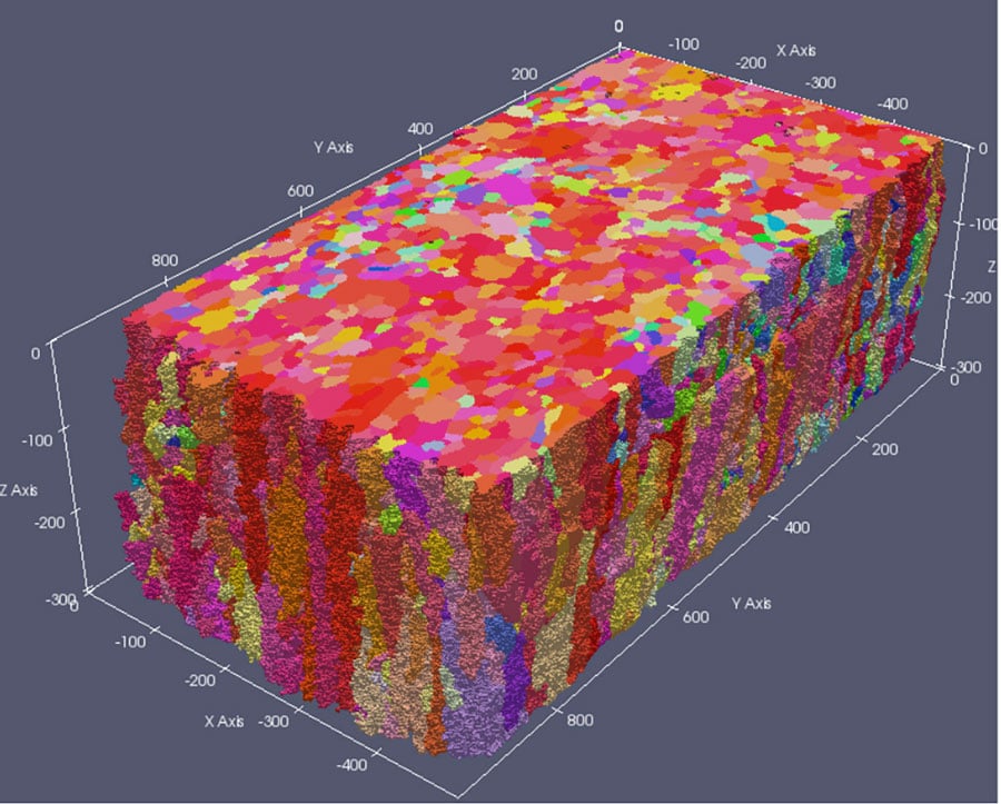 已经开发出一种称为Dream.3D(Groeber,2014)的软件包,用于使用实验3D数据来分析材料。它汇集了社区开发的工具和算法,以分析在扫描电子显微镜中各种模式收集的材料科学图像。将处理步骤组织成通常在十几个步骤上含有良好的流水线。此软件以前在桌面上运行,研究人员手动更改输入参数:这种工作方式意味着探索输入参数的相对较小的变化,可能引入偏差是实际的。但是,当Dream.3D与Bisque集成时,研究人员获得了输入每个参数的一系列值的能力。然后,使用不同的输入参数同时运行该程序的许多实例,节省了产生结果和提高重建质量的时间。还可以通过Bisque平台查看和可视化输出数据,因此研究人员不需要运行单独的计算密集型可视化程序。在一个单独的模块中,研究人员还实现了一种计算有效的算法来测试材料强度的量度。该模块可在线获取,可以从Web浏览器运行,并在Userend上具有最小的计算要求。