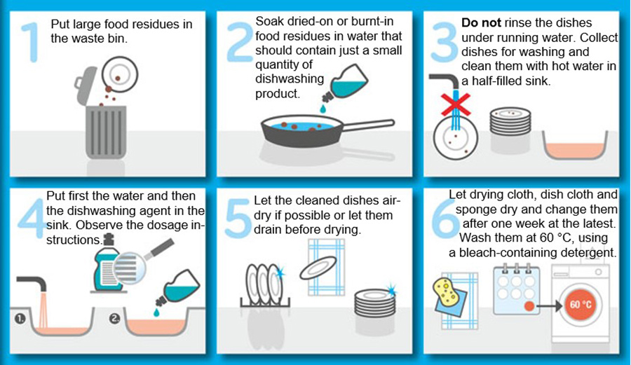洗碗建议已发布在欧洲网站上,例如德国家庭组织“Washen论坛”。 Stamminger前期研究还研究如何优化人工洗碗实践,包括收集项目、浸泡、洗涤、洗涤用量、冲洗和干燥透视所得包括使用更多洗涤剂并不总是导致更好的清洗结果,因为它导致更多泡沫粘附物并阻塞冲刷