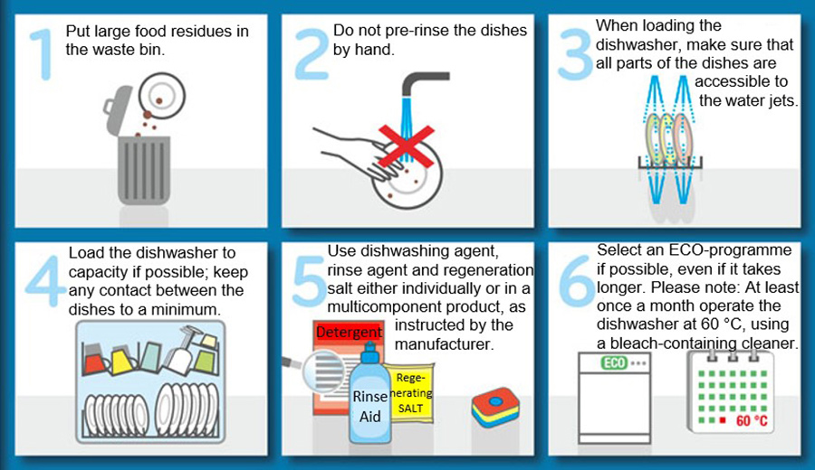 Schencking和Stamminger发现电洗碗的最佳实践技巧包括先处理垃圾桶中的食物残留物,如果盘子特别脏,则先在机器中冲刷项目应仔细加载以确保喷水机不阻塞并访问盘子所有部件洗碗机应加载容量,避免项目间接触并选择ECO设置为默认程序洗刷洗涤剂和材料应谨慎使用,例如,使用多构件清洗片片时不使用补充盐类和洗刷辅助件机器应每月至少运行一次60摄氏度使用含漂白剂净化器