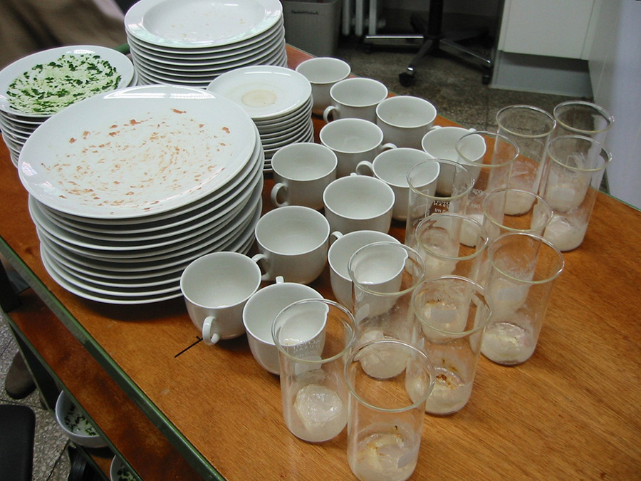 研究发现准备洗礼实践差异较小,大约75%的人洗碗前处理残留物受饮食礼节影响留空板被认为中国不切实际, 因为它表示宿主没有提供足够食物,关于处置方法,美国的一项研究发现洗碗机预冲刷项目使用约四升水,而人工预冲刷项目在送入机器前耗用100升水