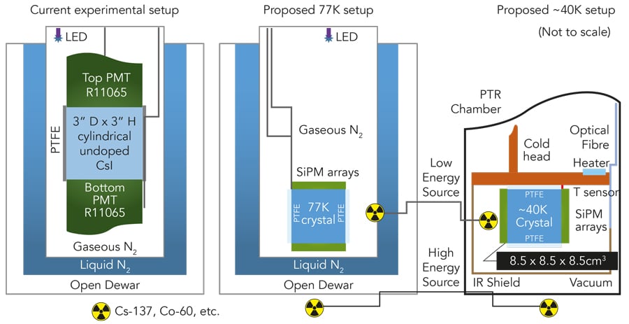 初始设置仅包含93克晶体和具有光敏圆形表面的PMT,其直径为2英寸。在南达科他大学的最新设置中,由两个3英寸的PMTS从其两个平坦的端面检查1.56公斤圆柱形晶体。实现了类似的光率。这证明了该技术也适用于具有实用价值的较大晶体。