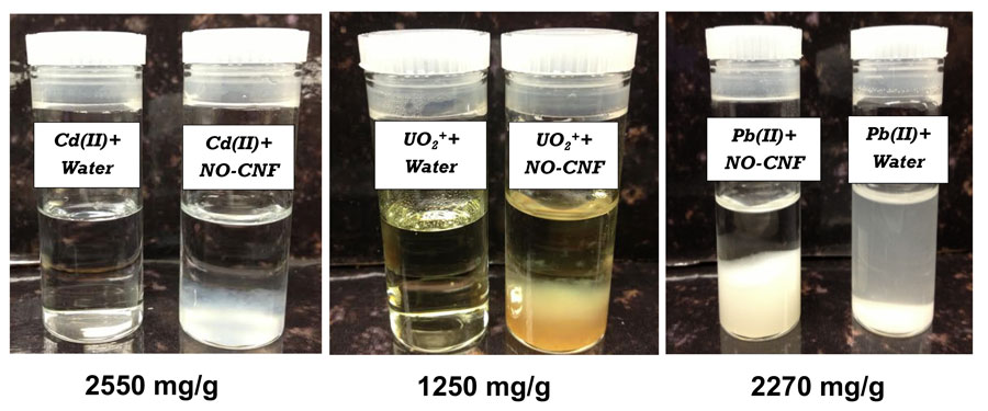 通过硝基氧化得到的纤维素纳米纤维提供优异的吸附剂材料,用于去除重金属离子,包括铅,镉,汞,铬,铀酰和砷以及水的细菌。对于重金属离子,已经报道了吸附能力高于文献中最有效的吸附剂的吸附能力。使用简单且廉价的重力驱动的微滤或倾析可以容易地除去金属吸附的纳米纤维素絮凝物。