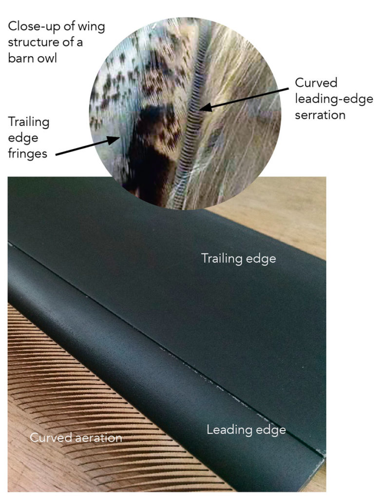 猫头鹰以其无声的捕猎技术而闻名:由于它们翅膀边缘独特的锯齿状特征,它们可以悄无声息地接近猎物而不被发现。利用锯齿改变前缘和后缘的几何形状,就像猫头鹰的翅膀一样,不仅可以改善空气动力性能,还可以减少不必要的噪声。该小组的研究基于这一事实,并提出了一项详细的实验研究,他们测试了正弦前缘起伏和尾缘锯齿与湍流相互作用的组合。他们的实验证明,将这两种修改相结合,可以获得显著的降噪效果。研究的一个重要发现是,锯齿能同时改变流体动力场和声场。锯齿的降噪被发现是一种集体的努力,其基础是流动的湍流能量的减少,以及沿边缘的声破坏性干扰。