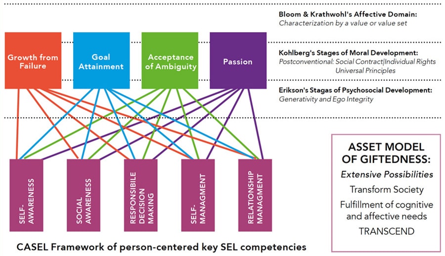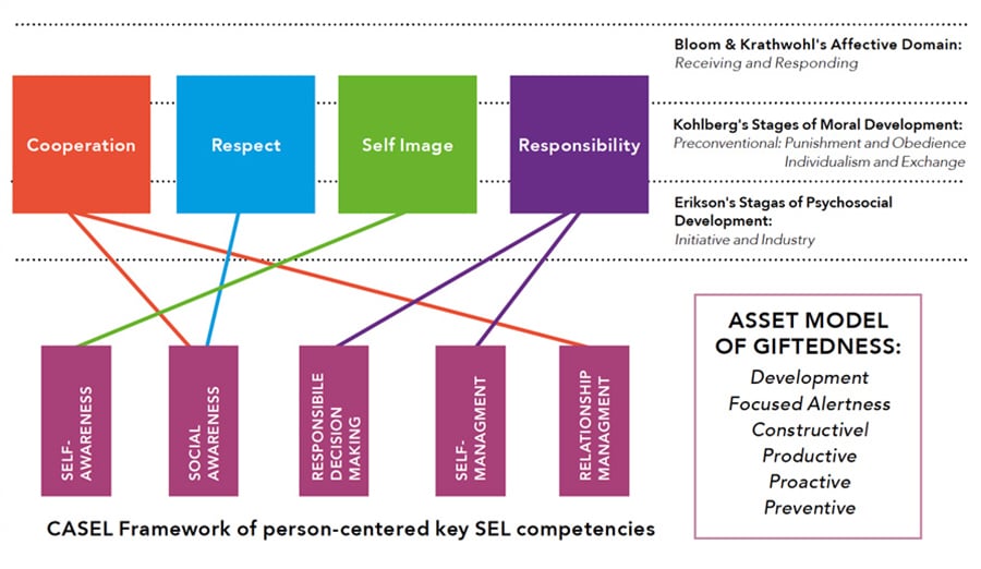 在CASEL框架中,第一级的四种技能(合作、尊重、责任和自我形象)中的每一种都与自我意识、社会意识、负责决策、自我管理和关系管理这五个支柱中的一个或多个相关联。在学习环境中应用这种方法可以帮助学生理解和管理情绪,设置和实现积极的目标,感受和表现出对他人的同情,建立和维持积极的关系,并做出负责任的决定。对于有天赋的学生来说,这些能力的发展可以帮助他们在发展过程中把自己看作一个成功的参与者。