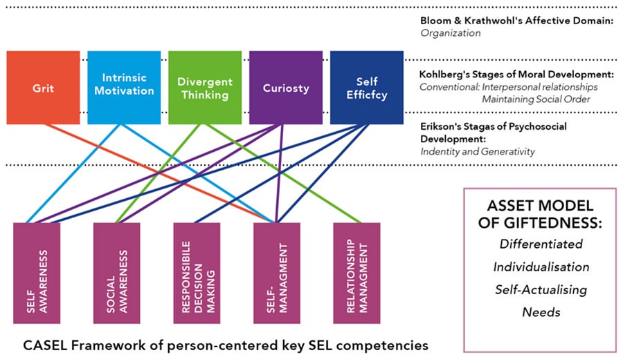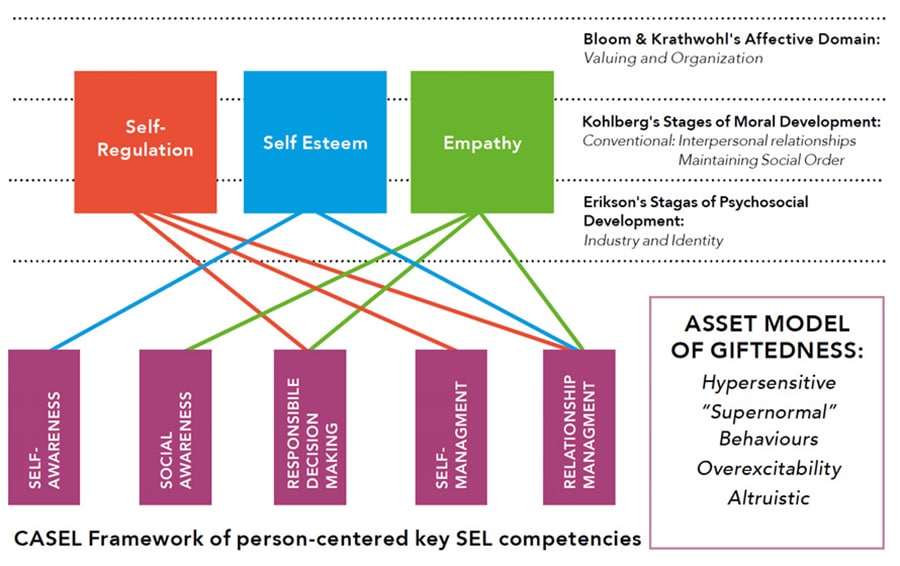 由学术、社会和情绪学习合作组织(CASEL)开发的社会情绪学习框架是Cavilla提出的天才学习者情感课程分类的基础。这段旅程从孩子教育的早期开始,在幼儿园。社会技能,如合作和责任,以及尊重的重要性,可以在这个年龄发展。