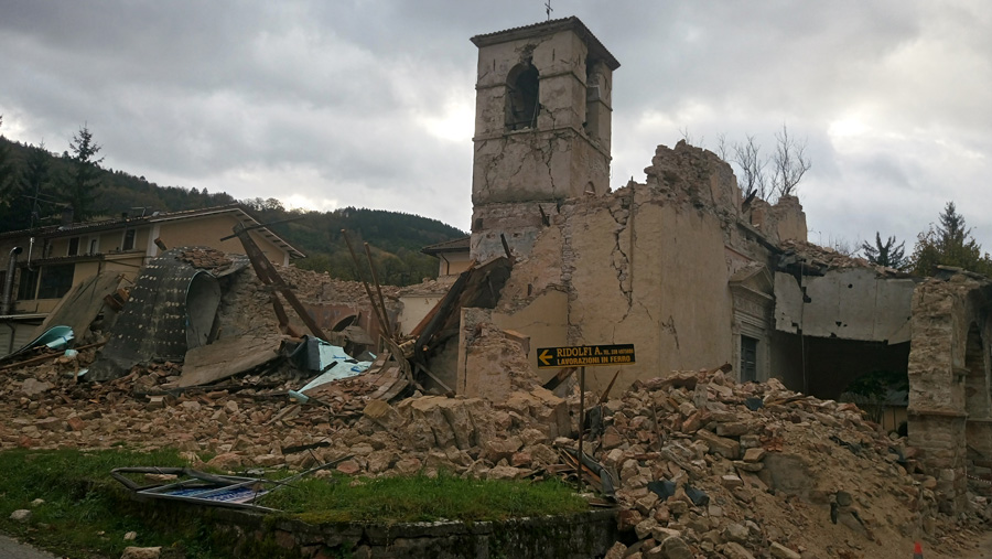 2016年地震后遗症14世纪Sant'AntonioAbate教堂,Visso与该地区许多其他历史建筑和城镇大都被毁