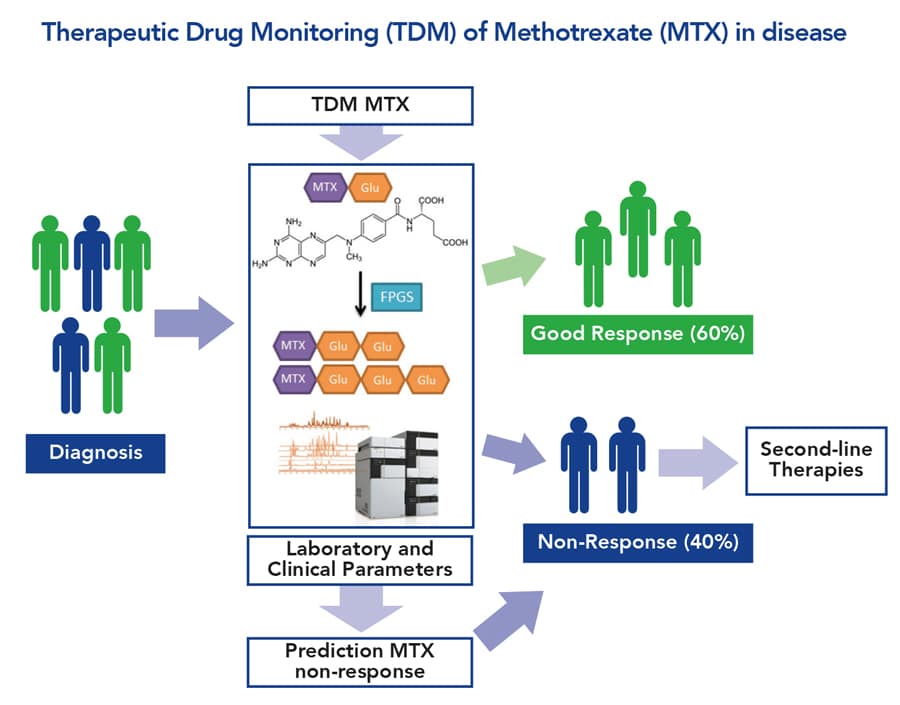 MTX治疗药物监测的目的是测量类风湿性关节炎患者血细胞中MTX- pgs的水平,并将这些水平与治疗反应联系起来。de Jonge教授预计,较高的MTX-PGs积累将促进对药物治疗的更好的反应,而较低水平的MTX-PGs可能出现在无反应的患者中。由此可以推测,fpg的酶活性可能很重要,因为低fpg活性会导致MTX转化为MTX- pgs的减少,因此对治疗的反应较差。