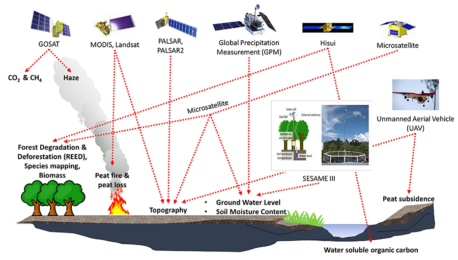 这种方法可在全球应用,但由于若干原因,小组把注意力大多集中在热带泥炭地上。热带泥炭地因商业农业(主要是油棕榈)、斜烧法和非法采伐以惊人速度退化热潮气候条件为相对快速再生提供潜力,假设采取了适当的补救方法(例如实施SW系统)。信息学赤道/地球观测系统(iEOS)是补充iMRV的一项重要新举措,它使用数种不同的光谱产品、3D摄影测量法和赤道轨道器上的温室气体传感器。卫星每天数度从赤道一带收集数据,以便制作马赛克图像,避免云层减轻赤道遥感的主要挑战之一:高云覆盖iEOS提供显著提高测量变量能力,如地下水位、土壤湿度、SOC、碳通量、CH4排放、植物养分物学和植物多样性(1)
