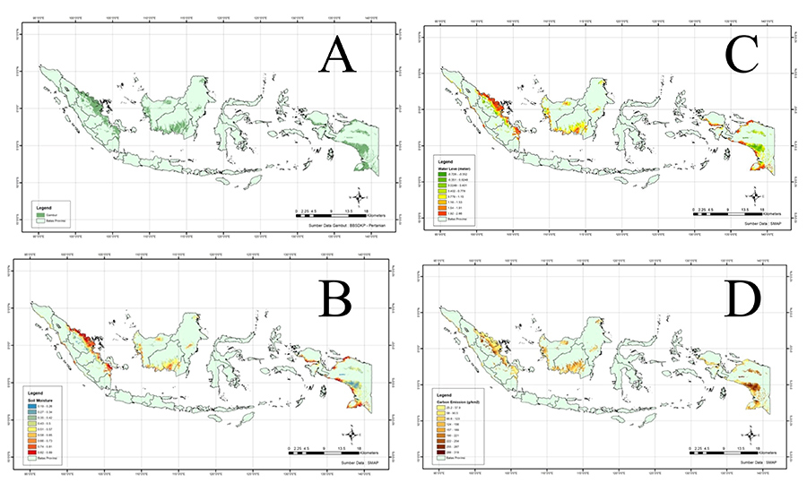碳通量映射对管理碳资源至关重要开发了各种方法和模型估计泥炭地碳通量卫星技术提供以相对低廉成本估计碳通量和高时空解析能力Osaki和同事利用这一技术开发新估计模型举例说,他们使用国家航空航天局卫星即土壤水分主动被动卫星的数据观察地下水层、土壤泥土稀疏和碳排放之间的强关联性地下水位每下降0.1m/年,碳排放量增加89gC/m2/年份旱季或干旱期间排放量较高(例如由IOD引起的排放量)(2)