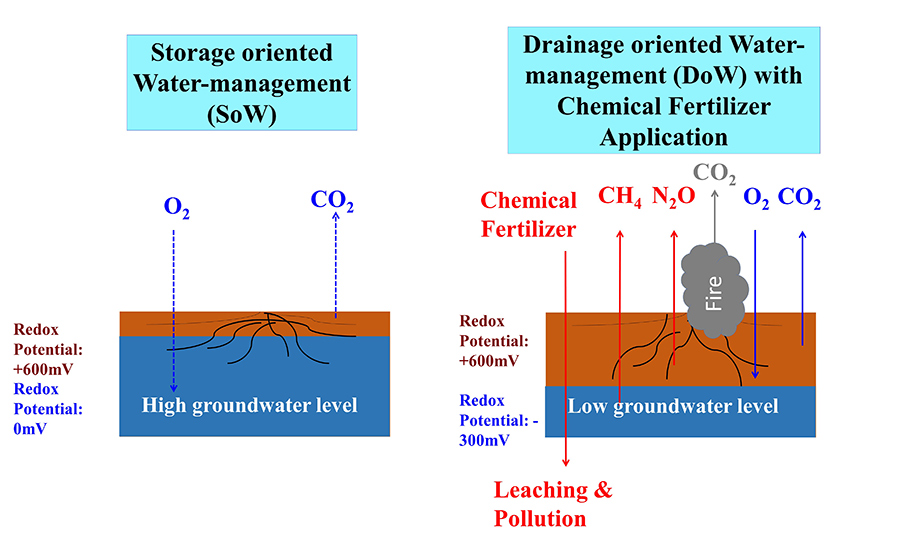 水循环中的这些变化导致碳排放增加,通过大火或微生物活动(分别称为热火和冷火氧化)氧化刺激碳排放然而,农业/林业区适当的水管理策略可用于缓解这些变化,甚至可产生碳负值系统多商工厂对地下水高位敏感,热带泥炭地传统水管理侧重于排水,称为“排水面向水管理”(DoW)(3)长期后果是泥土干涸(增加消防风险)、生物量下降(包括农业生产率下降)和碳释放到大气中,这诱发破坏性Triemma状态(4)
