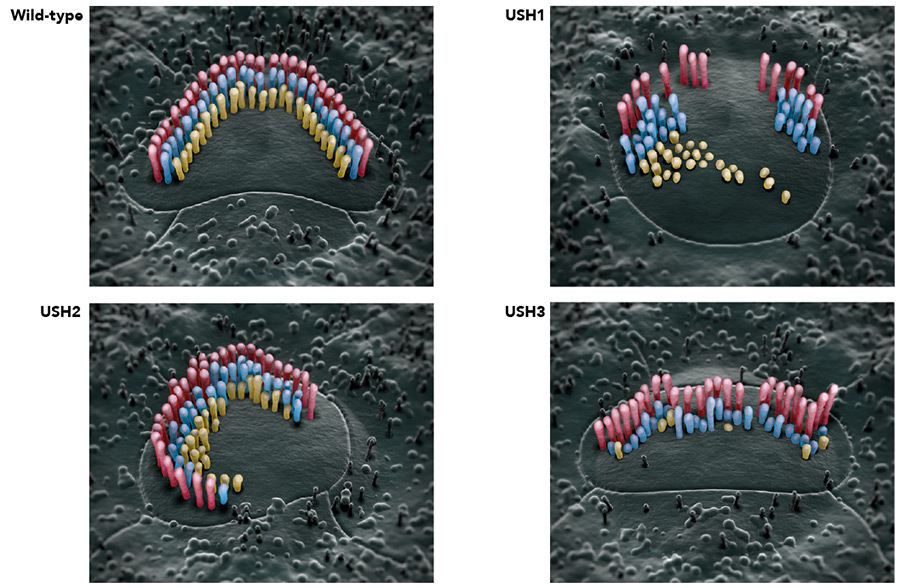 听和平衡都依赖被称为机械电移植过程,这需要将机械模拟器(听或头运动平衡声波)转换成电子信号,由神经纤维传递到中神经系统USH蛋白在结构功能上对内耳毛细胞至关重要USH1蛋白综合体对正常立体生长和适当编织发包是必备的,它构成连接连接立体相联的一部分