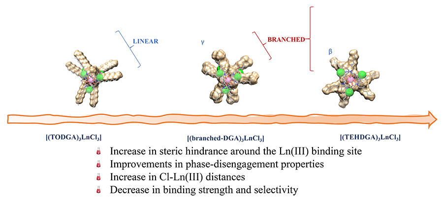 发现随着配体尺寸的增加,镧系元素的提取显着降低。当将这些宽敞的基团放置得太近DGA氧原子时,还观察到类似的还原。