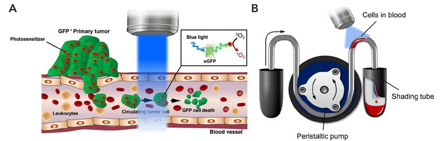 癌症患者的转移是危及生命的。在转移过程中,被称为循环肿瘤细胞(ctc)的癌细胞离开原发肿瘤位置,进入血液或淋巴系统。ctc扩散并积聚在周围组织和远处的器官中,然后变成癌细胞。当转移性癌症发展时,死亡风险显著增加。事实上,据估计,90%的癌症相关死亡是由转移性癌症造成的。这一估计在50多年来几乎没有变化。ctc于1869年被发现。然而,由于缺乏有效的检测技术,直到20世纪末期才开始对这些细胞进行研究。技术的重大进步导致检测和分离技术的改进,如抗体免疫磁分离、光纤阵列扫描技术和微流控平台。许多研究已经确定CTC值高与癌症预后差有关。 Therefore, it is essential that CTC-specific targeted therapies are developed that eliminate CTCs from the vascular system and improve prognosis. In practice, however, this has been challenging to achieve due to the unpredictable and dynamic nature of CTCs. Dr Choi and his team from Kyung Hee University and Dr Kim from Oncocross, Ltd set out to optimise the ground breaking photodynamic therapy (PDT) to focus on eradicating fluorescent protein-expressing CTCs.