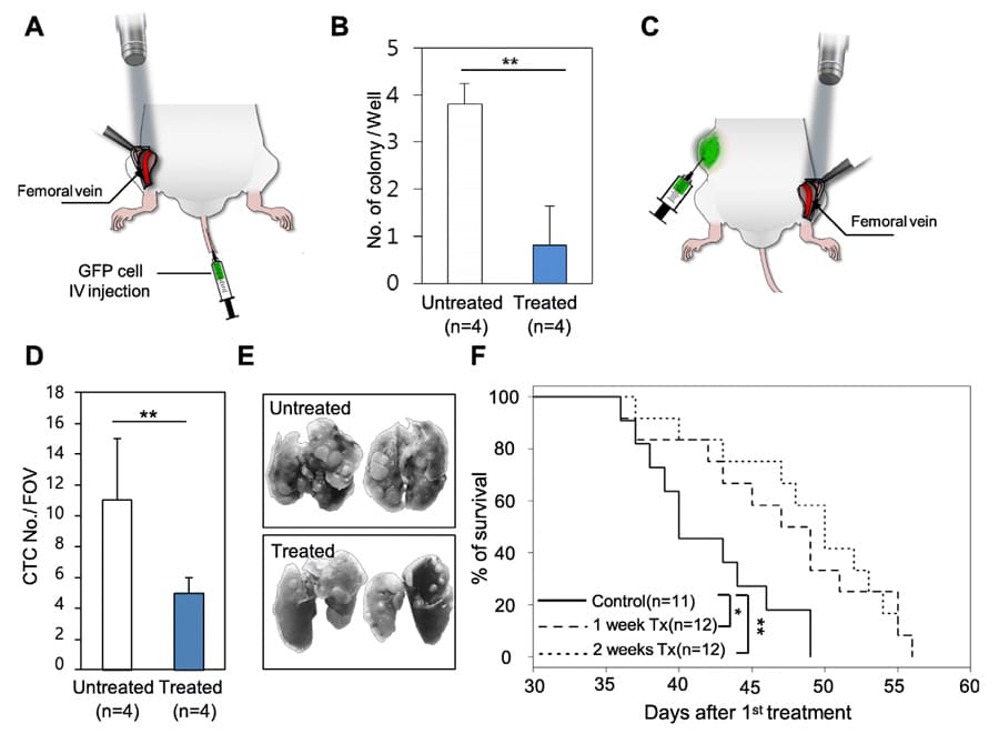 使用FRET PDT的研究的成功启发了Choi博士和Kim博士使用GFP表达的CTC和Rose Bengal靶向CTC消融。该团队进行了一项体外研究,使用一段连接到蠕动泵的管道来模拟血管内的循环。表达gfp的ctc和不表达gfp的ctc与Rose Bengal一起孵育,并通过导管。结果表明,与不表达gfp的ctc相比,表达gfp的ctc细胞损伤和死亡更严重。还进行了一项体内研究:将表达gfp的ctc和Rose Bengal注射到小鼠体内,然后用蓝色激光照射小鼠股静脉。结果表明,经处理的CTC菌落数量显著减少。此外,ctc靶向PDT在表达gfp的转移细胞被移植到小鼠侧翼的小鼠中进行。同样,受辐射小鼠的CTC细胞数量明显低于未受辐射小鼠。值得注意的是,治疗后的小鼠肺转移瘤的数量明显减少,而且存活的时间也比未治疗的小鼠长。令人兴奋的是,这些结果表明,以改善癌症预后为目标的ctc靶向治疗可能为发展个性化和精准医疗提供了一个有前景的新途径。