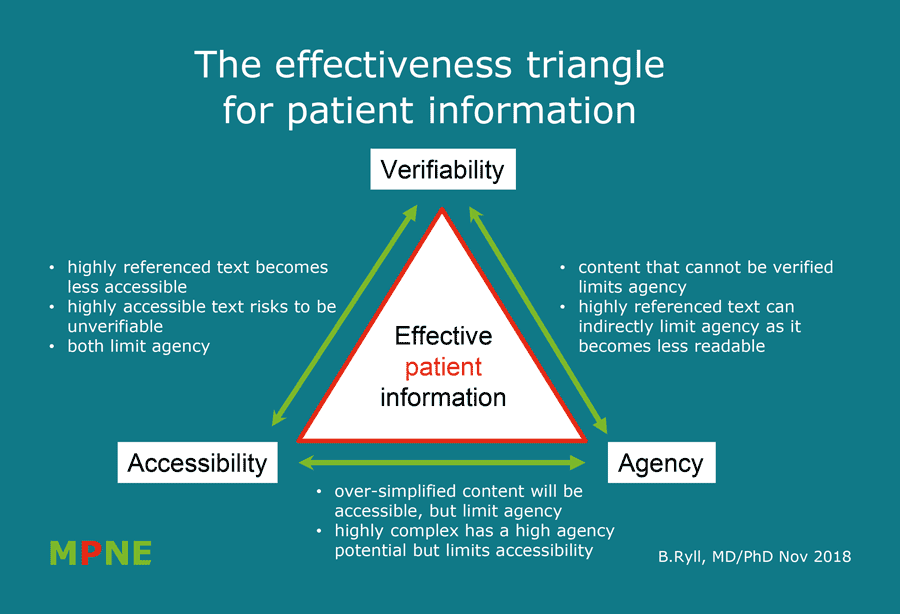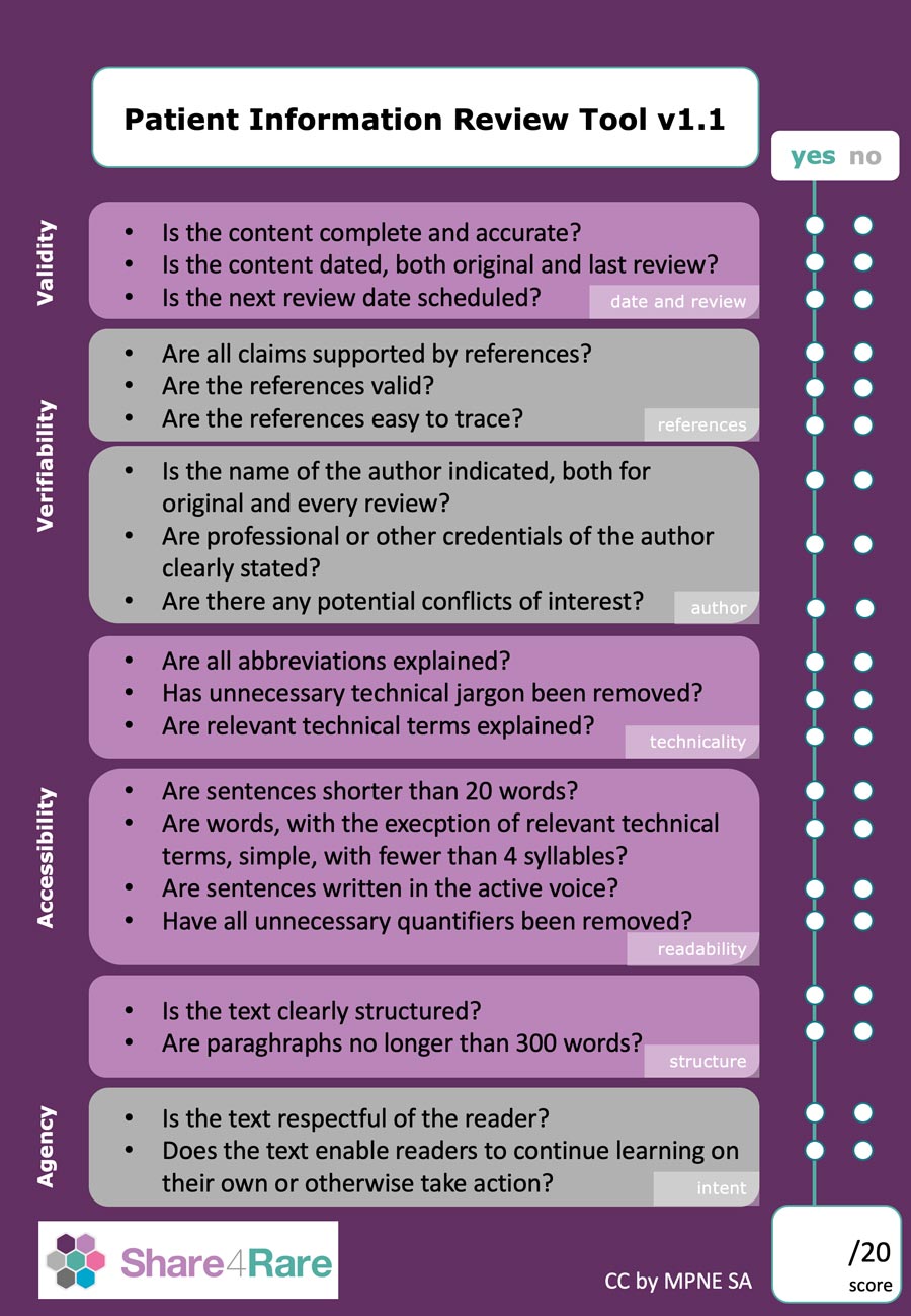 2018年,MPNE加入Share4Rare,该项目由欧洲联盟提供资助的项目,旨在促进患者在安全和非商业环境中的数据共享。Share4Rare的托管研究功能允许迅速启动具有验证参与者的研究项目,伦理委员会审查的项目和先进的数据保护确保患者的最佳利益。显而易见的是,Share4Rare将要求患者了解研究的价值和重要性,以便参与 - 而MPNE的有机种植网络化文化不会轻易转移到新的社区。V2A2therefore became MPNE’s effort to codify their learnings about what constitutes effective patient information in a scientific context as a multi-purpose tool that could be used to either directly review existing patient information material or to educate about the four domains that the advocates has identified as highly relevant: validity, verifiability, accessibility and agency that then became V2A2.