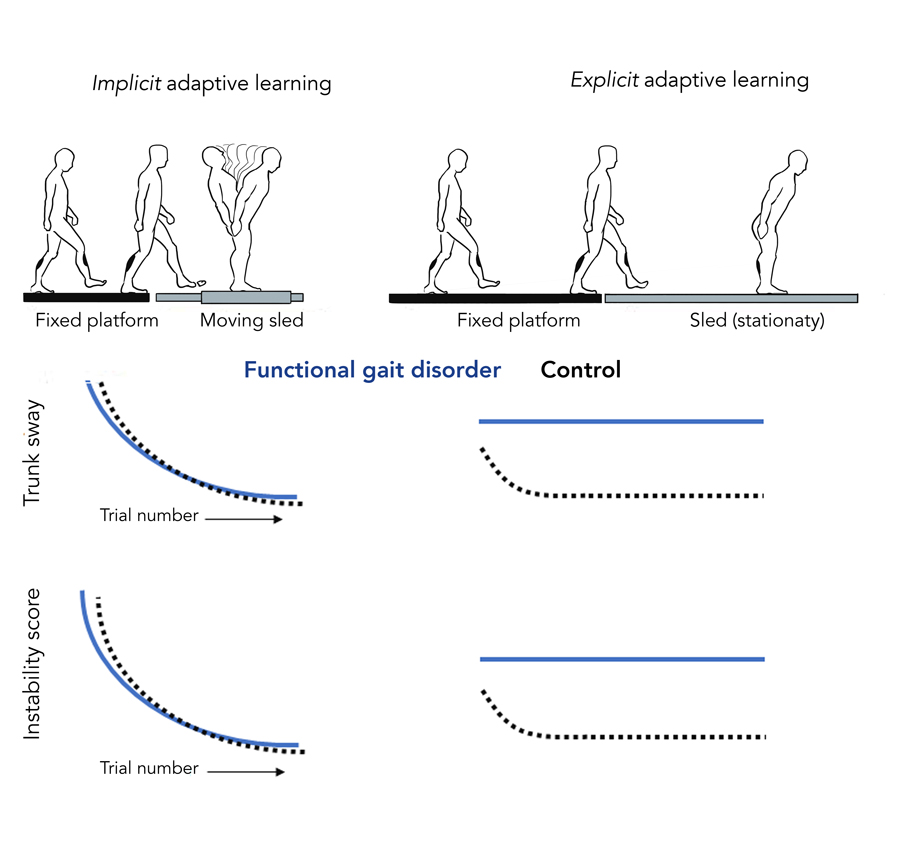 卡斯基教授和他的同事们试图利用电梯坏掉的现象来探索功能性步态障碍患者的运动学习能力。在雷诺兹和布朗斯坦启发的实验中,他比较了14名患者和17名对照组(没有功能性步态障碍)。人们在一个固定的平台上移动五次,然后在相同的平台上移动十次,然后再回到固定的平台上,每个人都事先得到平台移动变化的警告。