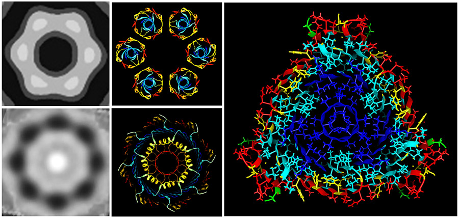 盖伊博士发现一类结构 被称为Di-BARREL 会与所有可用信息一致Fibrils多层e表骨架链BE-strands 尽可能拉伸线类结构相邻单片绑定成e表小组件这些表可以滚入圆柱形组成e-BARRELS盖伊博士怀疑,像fribrils,这些桶可能有多层桶大小大相径庭,取决于组成桶的多石化链的长度和数多数Fibrils中所有单体都具有完全一致性if this strue对Di-BARRES使用它会大大简化建模过程辐射对称可检测到氨基废品原型和转膜通道显像底管理论开发良好,因此,如果可确定底管直径和对称性计数,骨架本身可预测性极强
