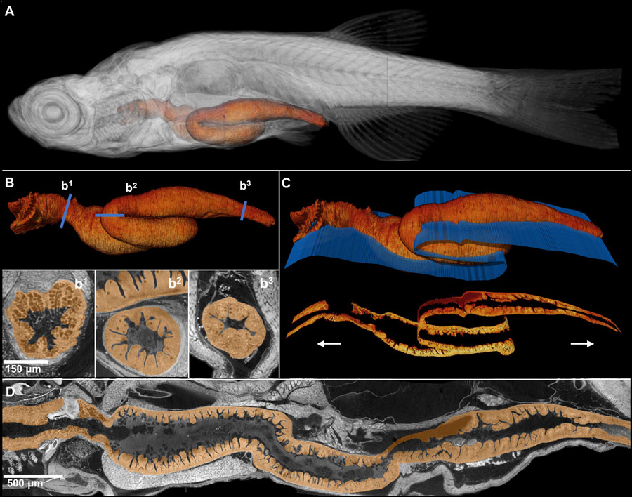 通过x射线组织断层扫描,郑博士和他的团队能够获得整个斑马鱼的三维数字重建。这些数字斑马鱼允许组织和细胞在整个动物的器官系统中被可视化。虽然传统组织学和组织断层扫描都具有在二维切片上区分细胞特征所需的分辨率,但只有后者能显示细长、复杂的三维组织结构,如血管、神经束和骨骼。全体积组织的数字表示为一种全新的“组织学”形式创造了机会,我们可以在任何角度或切片厚度的组织上进行数字“切割”和“再切割”。参数可以定制,以方便可视化各种组织结构。当使用x射线组织断层摄影术时,可以观察到通常组织学无法观察到的结构。例如,该团队能够研究鳃和肠道等复杂结构的特征。