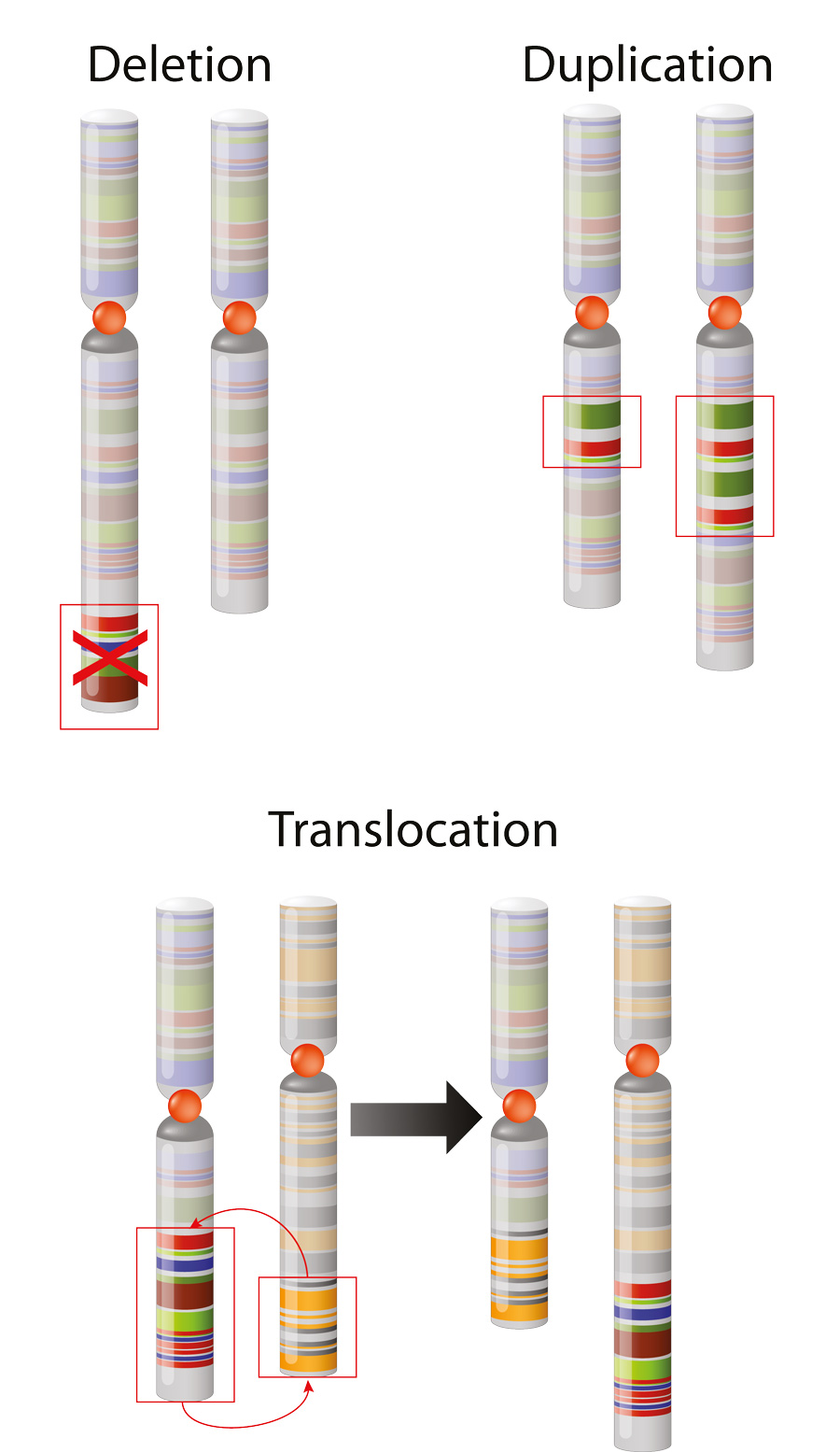 科学家可以视觉化一整组元相染色体-这叫karyo类型,染色体按大小和形状组织karyo类型分析可发现基因异常,如缺染色体、额外染色体或基因变异,如删除(脱氧或脱氧序列部分复制脱去脱氧核糖核酸)、重复复制(生成序列的另一拷贝)和移位(染色体分解块并重新连接到另一个染色体中)。异常染色体对病人有深远影响,三叉状21(own综合症)、三叉状18(Edward综合症)和三叉状13(Patau综合症)由额外染色体拷贝产生