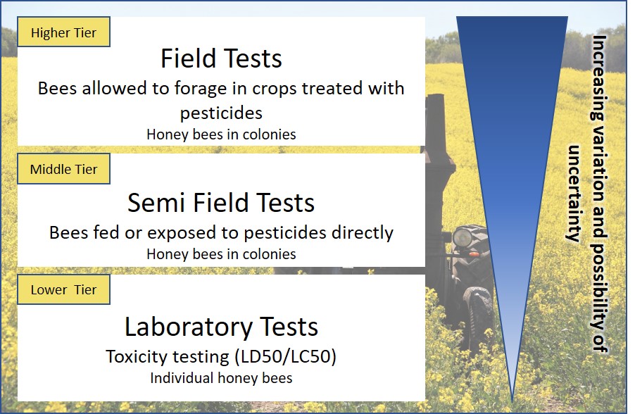 在第一级测试之后,如果发现杀虫剂对单个蜜蜂有害,风险评估就会转移到更昂贵的更高一级,涉及整个蜜蜂群体。更高层次的测试结果确定了一种杀虫剂是否对所有传粉者都安全。