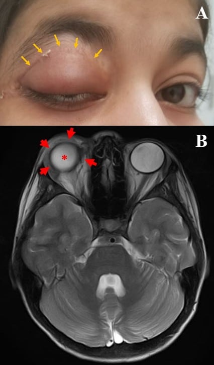 这是一个14岁的女性,最初提出两年后,伴随着无痛的右上眼睑肿胀,如图1a所示(被视为蓝色箭头)。在检查时,右眼睑具有重要的水肿,然而,眼球的完全移动性。在触诊期间,在眼睑下悬垂辛苦,非移动病变。为了确认病变的程度,进行磁共振成像(MRI),其显示出在轨道的边界,中间,内侧和横向(由红色箭头示出)限制的增强病变。病变对潜在的地球仪(显示为星号),然而,具有完整的右视神经和内侧,横向和劣质肌肉[图1B]。