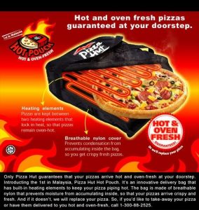 这个例子是一个马来西亚的广告,通过加热元件,火焰图案背景,热红色渐变,和标语:“热和烤箱新鲜保证!”从字面上看,这个设计代表热;但是作文中充斥着信息。这体现了马来西亚设计师所谓的“混合一切的设计”,即每一个文字设备都被用于表达信息,而不考虑信息的美学和有效性,甚至试图推动观众进入思维模式。