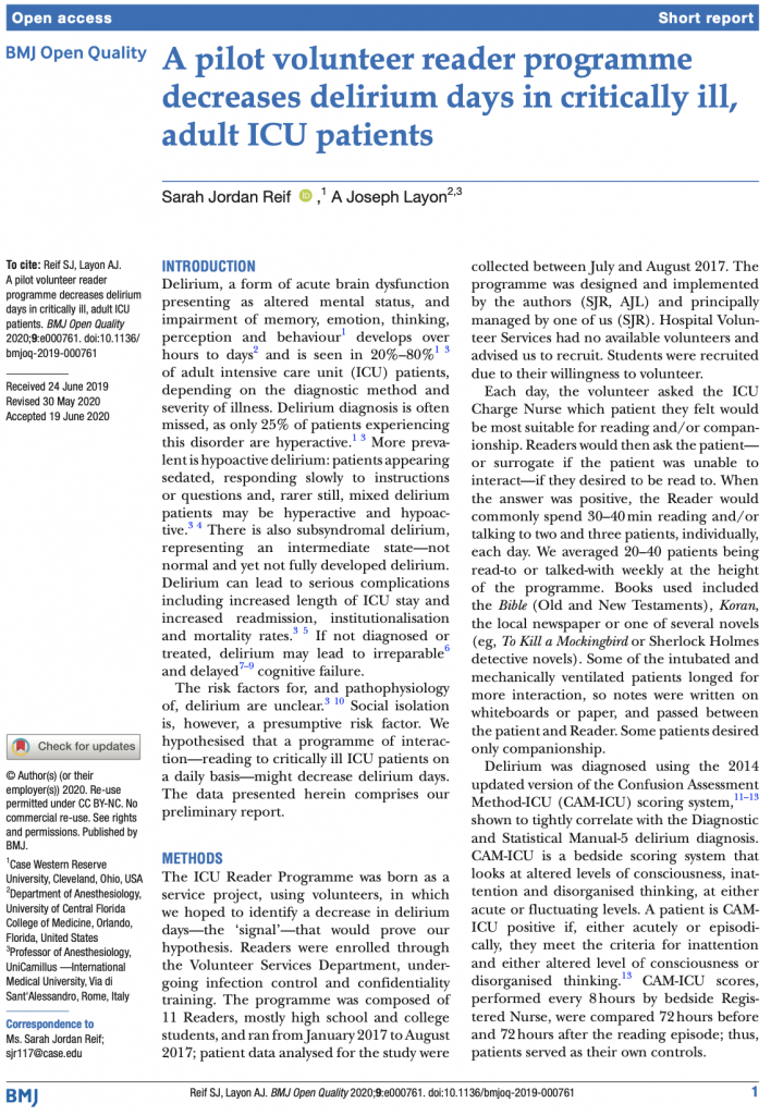 一项试点志愿者阅读计划减少重症监护室危重病人的谵妄天数