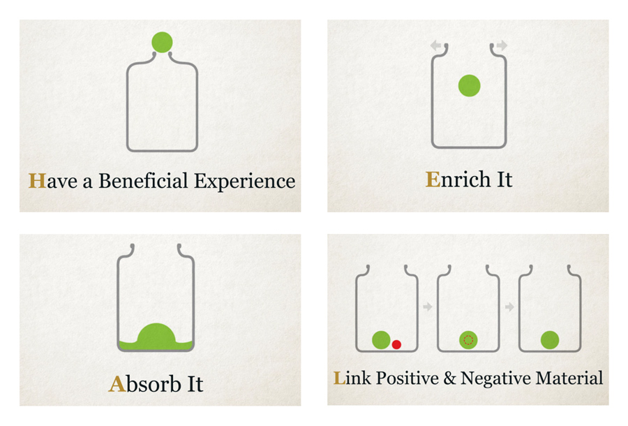 持久增加心理资源,如情感智能,必须分两阶段过程,即脑中安装经验二级关键单靠体验不产生学习在HEAL框架内,第一阶段总结为`有'有益经验,要么注意到已经发生或故意创造(例如提醒自己耐心)。第二阶段涉及以各种方式“丰富”经验(例如延长吸气时间或更长时间)和通过提高脑敏锐度来Absorbing归定链路可选性, 即正素与负素并存并代浓缩和吸收步骤包含八种基于证据方法,这些方法显示会增强神经复元变化,联通步骤涉及相关方法,干扰隐式内存负质重归