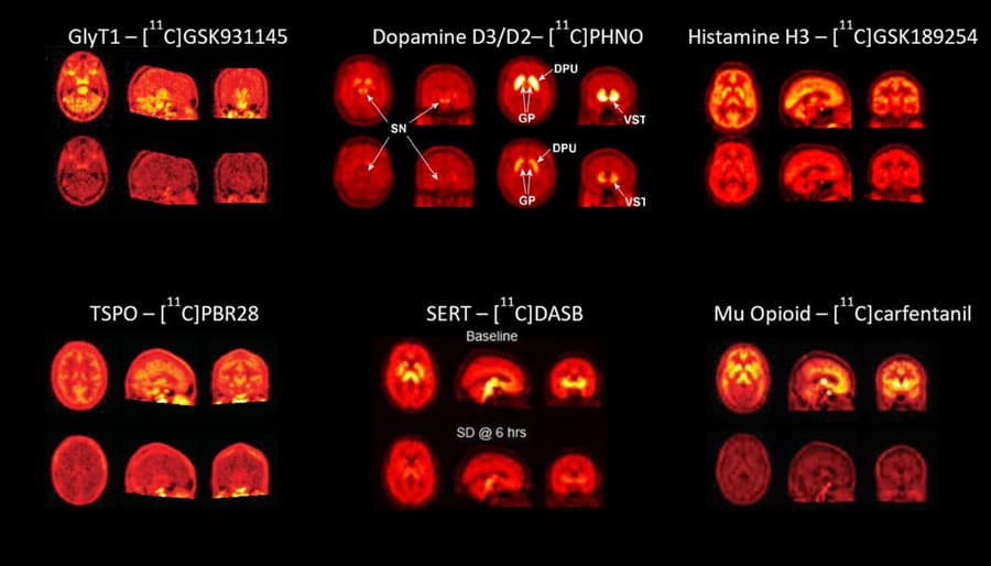 候选复合物中碳或氟原子代换正方释放同位素(11C或18F)不会改变药理或物理化学特性并允许可视化复合体体分布人体组织如脑中的绝对集中度可以精确量化,并比对等离子体测量度以理解组织分布