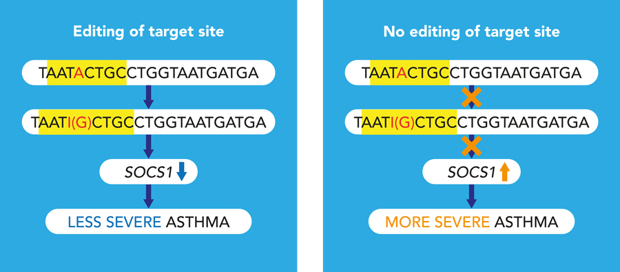 实现该目标的一种可能方式是通过RNA编辑过程,这一过程涉及改变基因序列并改变基因表达层次如果我们能模仿气流细胞中没有哮喘的人的分子路径,这可能为严重气喘提供新颖的治疗选择