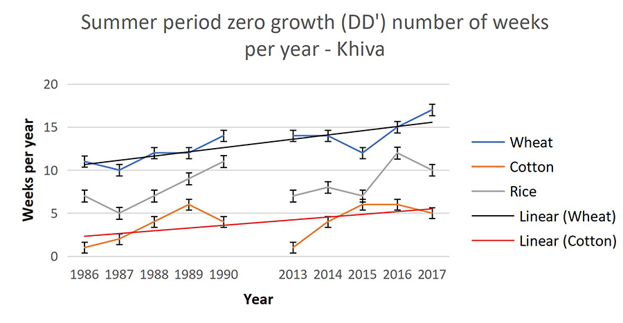 温度对植物开发起着关键作用极端热冷温度会干扰甚至停止植物生长,严重影响作物产量独立研究者Julian Schlubach研究西乌兹别克斯坦农区气候趋势分析本地气象资料和气专委未来气候预测以确定原生作物曾经和将来如何受变暖气候影响