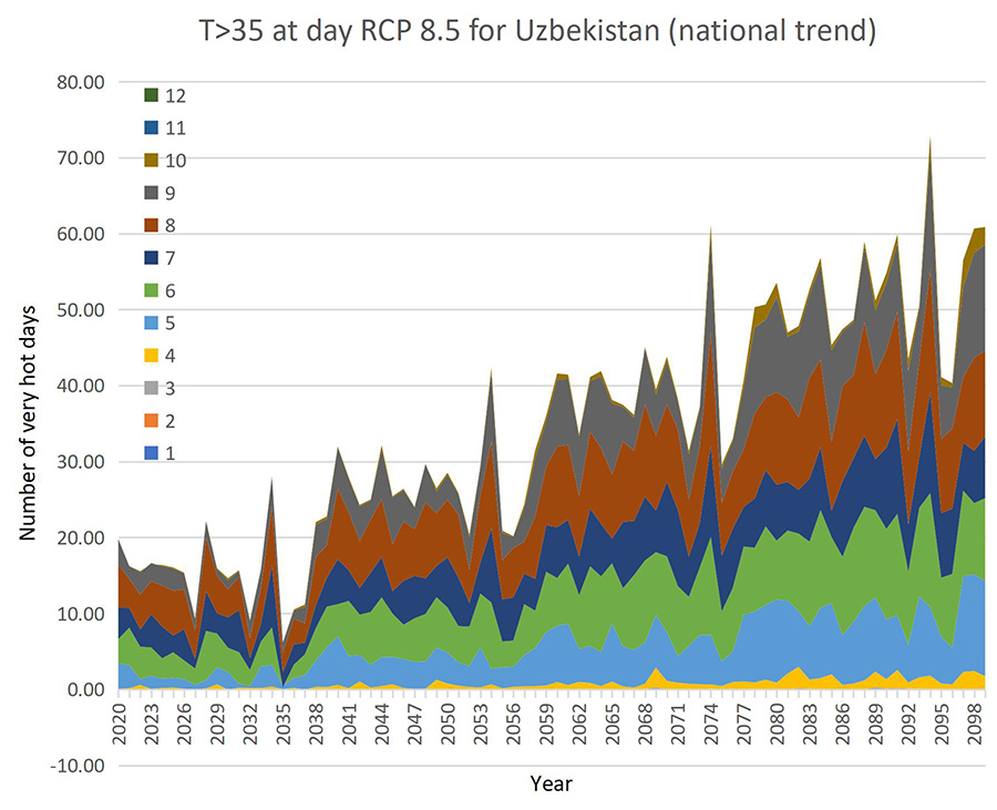 IPCC表示,中亚区域平均热量为1-2摄氏度,全区域基于水文和地理差异的巨大区域差异模型虽然不向这个分区说明问题,但它提供点东西与四个气象站的数据比较本研究选择最稳健的气候假设到22世纪趋势,显示到本世纪末将增加3.7摄氏度