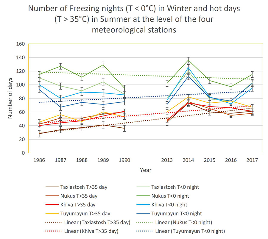 自1986-1990年和2013-2017年两个五年期四站趋势评价显示35摄氏度以上日数明显上升趋势增加时间从每年0.39天到1.19天不等。微量淡化冷淡数日数,但没有春季和夏季温度上升那么显著基于IPCC预测通向21世纪的趋势,热日数有可能继续增加估计显示35摄氏度以上天数将从1986年的28天增加至2100年的164天。至2100年,单日都不适合5-9月期间植物生长