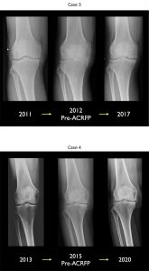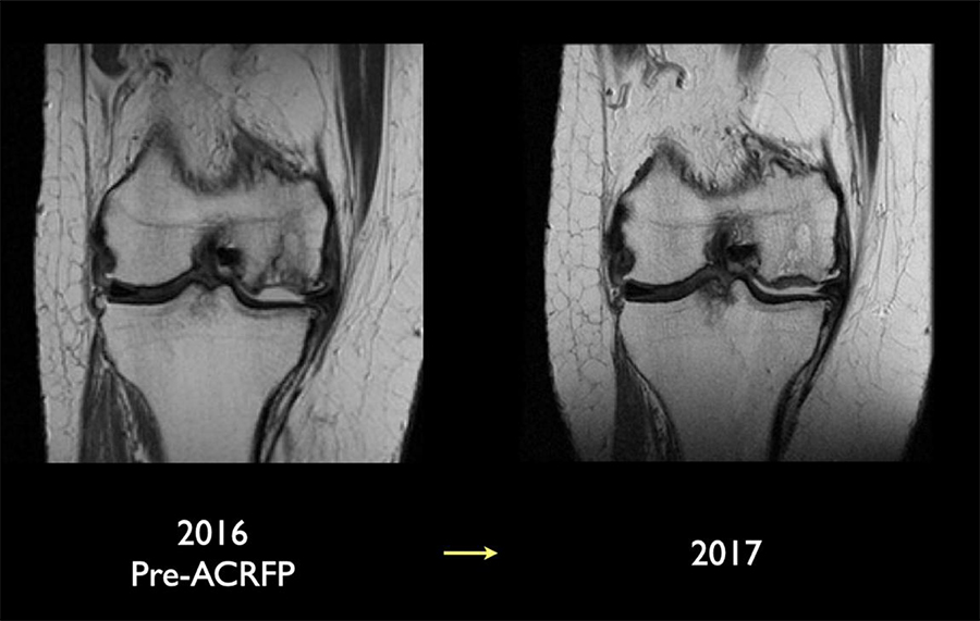 Lyu及其同事在另一项研究中跟踪膝部OA三年后ACFP测试记录他们的膝部评分和膝部受伤和骨髓炎评分团队随后对这些分数进行了预处理和后处理比较结果表明91%的病人对治疗感到满意,即使是那些患有高级(四级)疾病的病人也是如此。确定KSS和KOOS分数后处理提高,显示症状解析和提高生活质量放射结果分析显示80%的病人回转软机变换(图3),而MRI结果研究显示72%的病人回转软机变换(图4)。